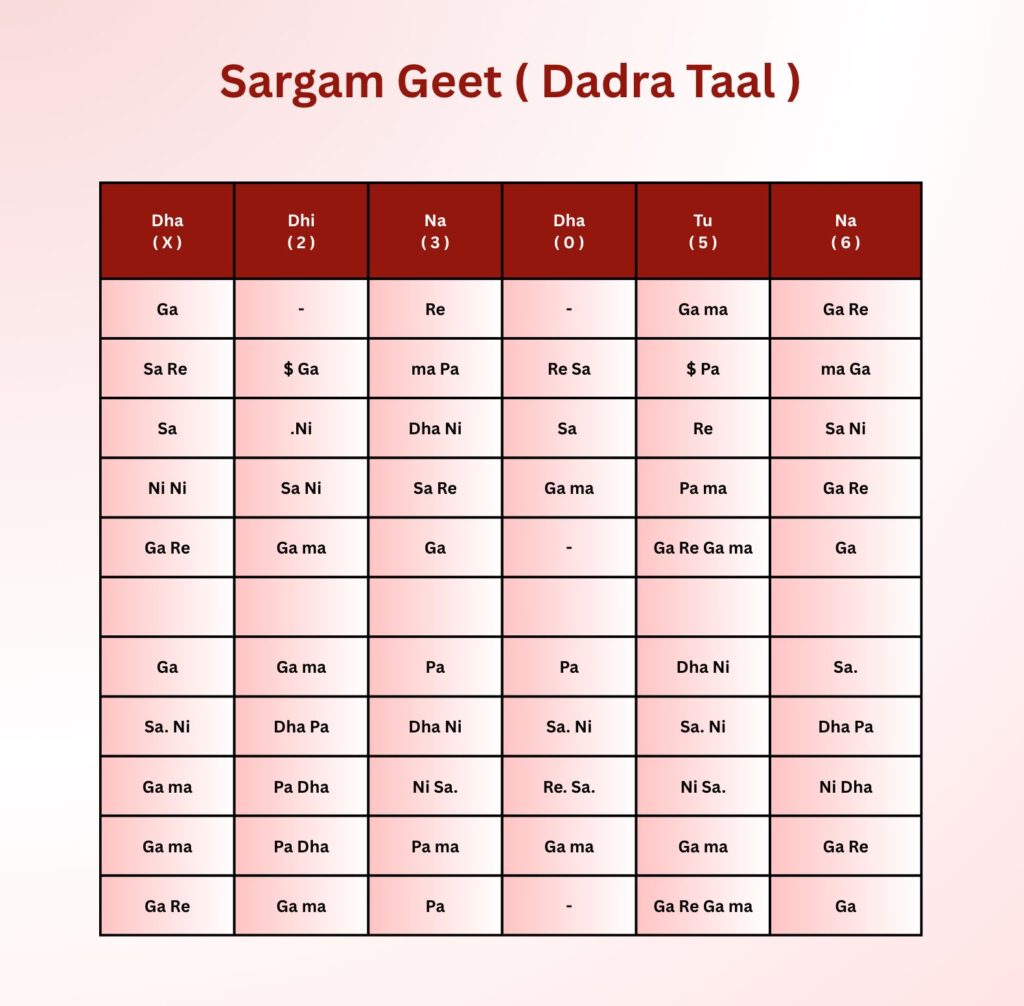 Sargam geet is a musical form in Indian classical music that uses the sargam notes instead of lyrics to compose a song. It’s a way to learn and practice the melodic movement (chalan) of a particular raga (melody). Sargam geet also helps with understanding the grammar of ragas and the movement of notes within them.When the sargams of Different ragas blends in taal than it gives rise to the Sargam Geet. Sargam Geet usually builds up with the raag nature and used vadi and sambadi notes. Sargam geet also can be improvised. the basic taals such as Tintaal, Jhaptaal, Dadra, Keherwa uses the sargam geet. the sargam geet also later produces the Bandishes in Different Raaga.